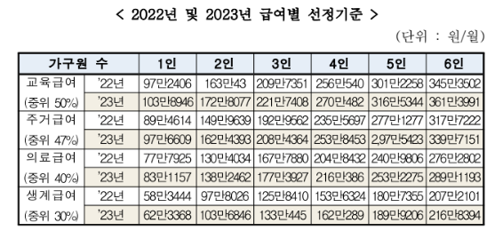 교육급여는 학교나 시설에 입할할때 입학금과 수업료 학용품비용과 그밖에 수급품을 지급해주는 제도로 교육급여에서 제외대상은 중학교 의무교육을 받거나 법령에따라 학비를 감면 받는 경우가 있습니다. 교육부장관이 정하는 장학기 필요한 사람은 지원받을수 있는점 참고하시면 되겠습니다. 중앙생활보장위원회에서는 2023 중위소득 인상과 함께 각 급여별 기준 및 최저보장 수준도 확정했답니다. 요즘은 중위소득 100% 기준으로 지원되는 경우도 많다 보니 잘 알아보시고 혜택 받으셨으면 좋겠습니다